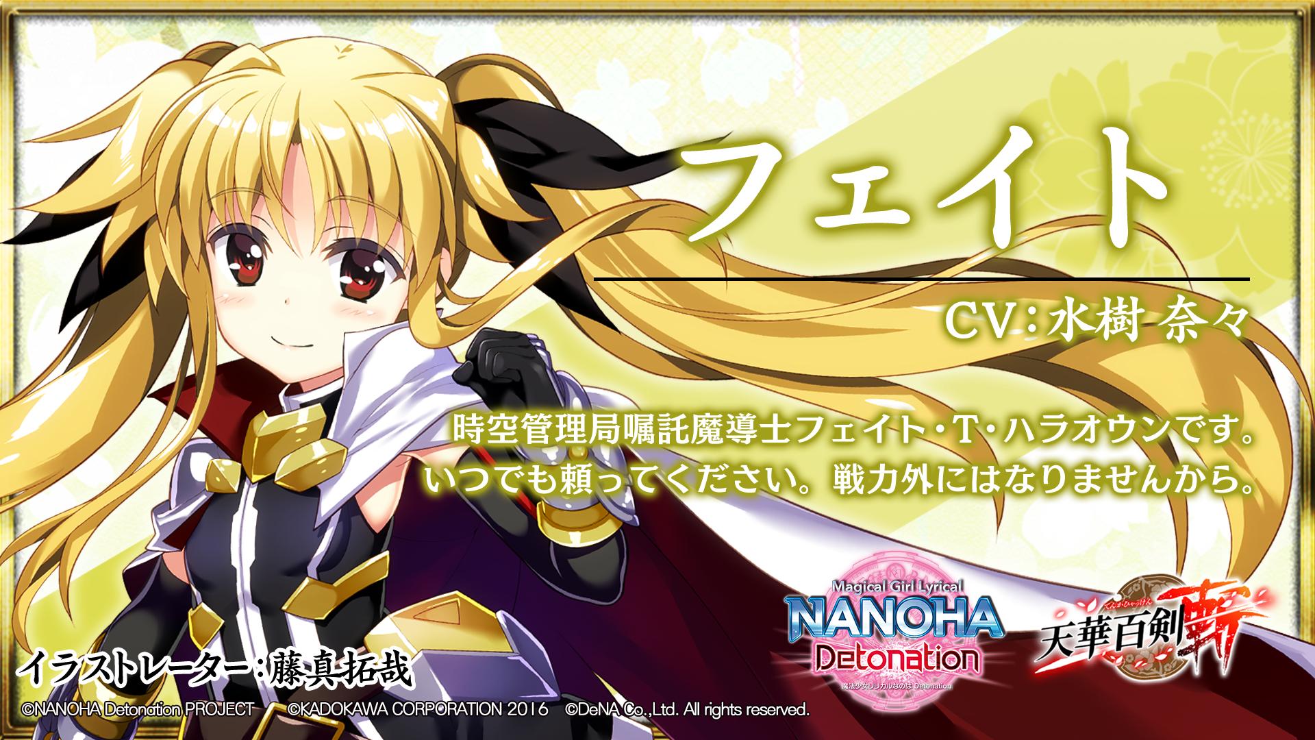 公式 天華百剣 斬 على تويتر フェイト T ハラオウン 魔法少女リリカルなのは Detonation の世界に現れた黄金の禍要柱を調査中 銘治に転移した時空管理局嘱託の空戦魔導師で 高町なのはの親友 なのはと共に黄金の禍要柱の調査に乗り出す Cv 水樹奈々